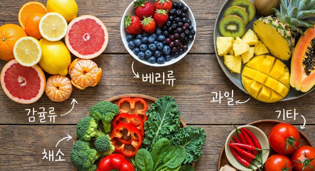 - 채소: 브로콜리, 파프리카(특히 빨간색), 케일, 시금치